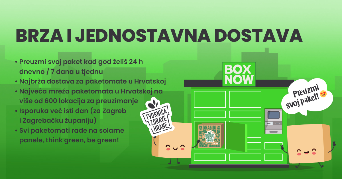 U želji da vam omogućimo još bržu i jednostavniju kupovinu s veseljem vam predstavljamo našu najnoviju uslugu dostave putem BOX NOW paketomata iz kojeg svoje pakete možete preuzeti uz trošak dostave od samo 1,99 €! (U slučaju da je iznos košarice veći od 39,99 € - tada je dostava u paketomat POTPUNO BESPLATNA).