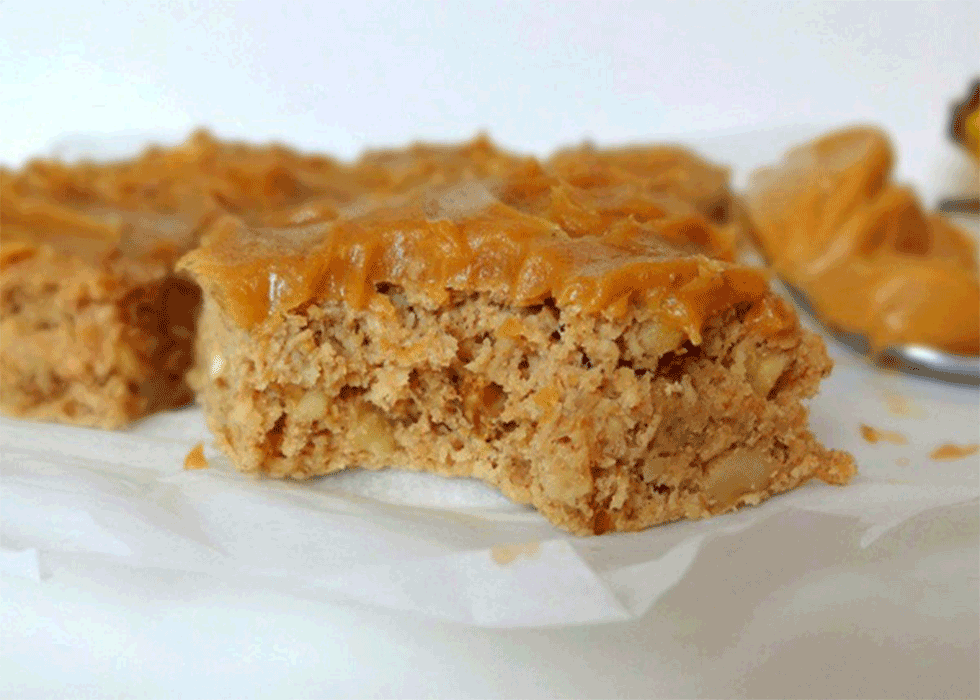 Priprema: Zagrijte pećnicu na 180 stupnjeva. U zdjeli pomiješajte brašno, šećer, sodu, sol i cimet. Dobro promiješajte pa dodajte pire banane i mlijeko. Povežite pa ubacite komadiće lješnjaka ili badema. U pleh 22x22cm stavite papir za pečenje. Smjesu koju ste dobili stavite na papir i pecite 12-15 minuta. Dok se biskvit peče, u zdjeli pomiješajte kikiriki maslac i javorov sirup. Ako će vam krema biti pregusta, dodajte malo vode i dobro promiješajte. Pečeni biskvit stavite hladiti u hladnjak pa narežite na kocke, a potom svaku kocku namažite kremom.