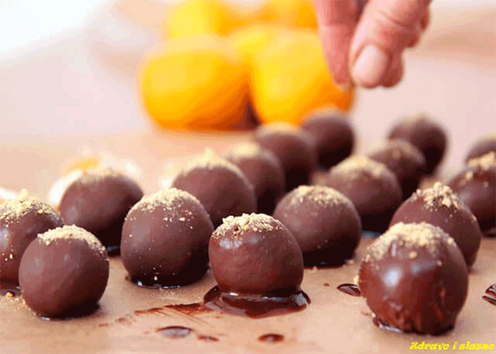 - Uzmite kuglice iz hladnjaka te ih uvaljajte u čokoladnu glazuru(možete koristiti štapiće). Po želji pospite naribanom i finom usitnjenom nešpricanom koricom od naranče. Smjesu na kratko stavite u hladnjak da se stisne.