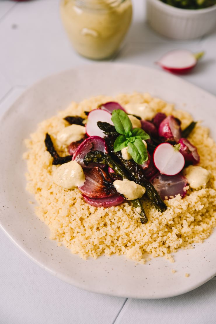 Kuskus s pečenim šparogama i rotkvicama je jednostavno jelo koje oduševljava svojom svježinom i raznolikošću okusa. Ova kombinacija nježnog kuskusa, aromatičnih pečenih šparoga i osvježavajućih rotkvica stvara iznenađujuće ukusnu i uravnoteženu poslasticu.