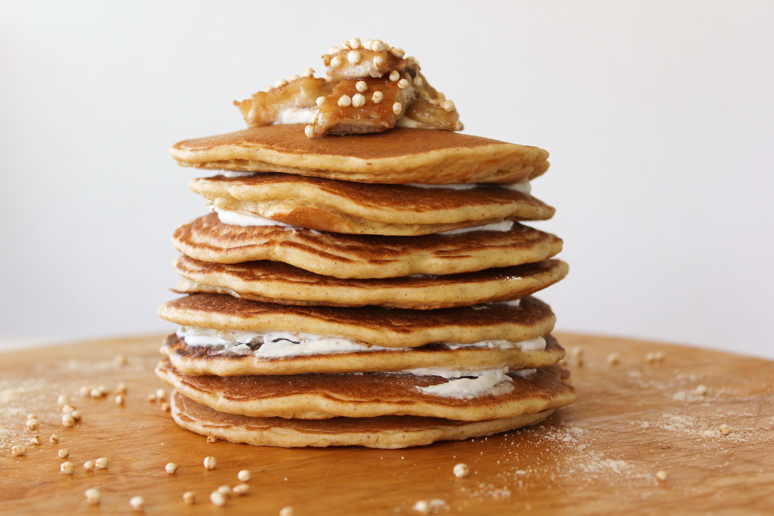 6. Palačinke namazati preostalim grčkim jogurtom (ili namazom po želji), te na vrh servirati banane i dekorirati kvinojinim popsom