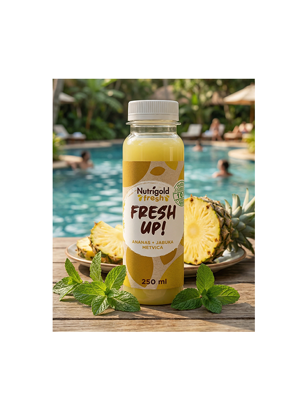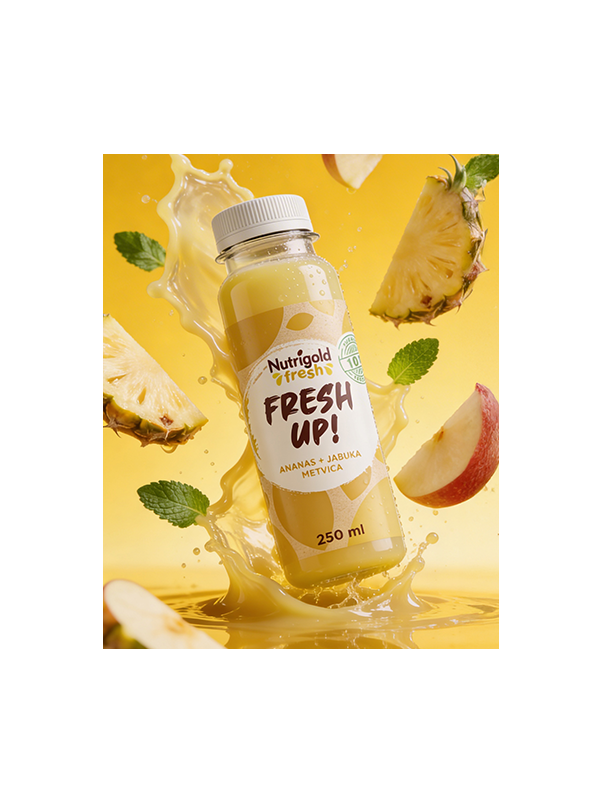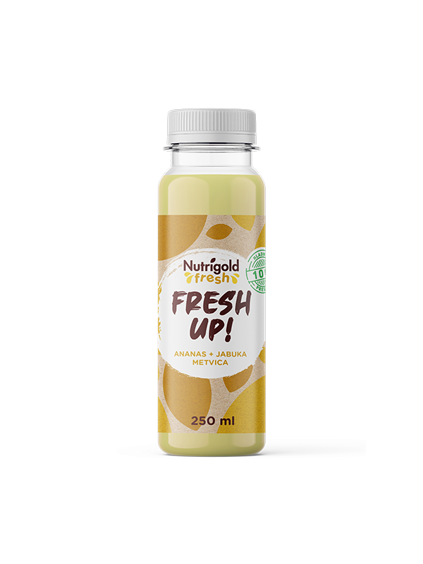 hladno prešani sok ananasa 68 %, hladno prešani sok jabuke 30 %, hladno prešani sok metvice 2 %