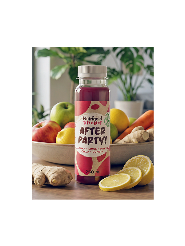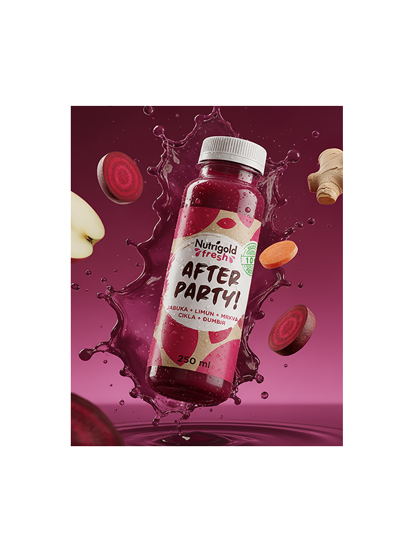 After party nije samo običan napitak, on je vaš idealan partner za dobro raspoloženje. Zamislite da ste usred napornog dana – jedan gutljaj i odmah vas podiže. Prije nego zgrabite bocu, samo ga protresete – kao da ga budite iz drijemeža – i spremni te za osvježavajući val svježine koji prolazi kroz vaše tijelo. Hladno prešano znači da svi okusi ostaju netaknuti, svježi, baš kao da ste upravo ubrali voće i povrće sa stabla ili iz vrta.
