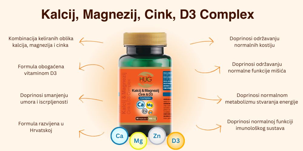 Kombinacija keliranih oblika kalcija, magnezija i cinka te vitamina D3 s visokom bioraspoloživošću i iskoristivosti razvijena je u Hrvatskoj baš poput ostalih Hug Your Life proizvoda. U zadnjih 10 godina poslovanja, volite sve više njihovih proizvoda.