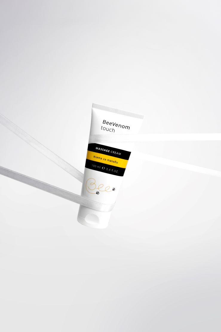 BeeVenom touch krema za masažu - prirodna krema s pčelinjim otrovom koja sadrži čak 70% melitina, zbog čega je jedna od najpotentnijih krema za masažu na tržištu. Ubrzava mikrocirkulaciju krvi, pomaže u ublažavanju bolova, ima protuupalno i analgetsko djelovanje.