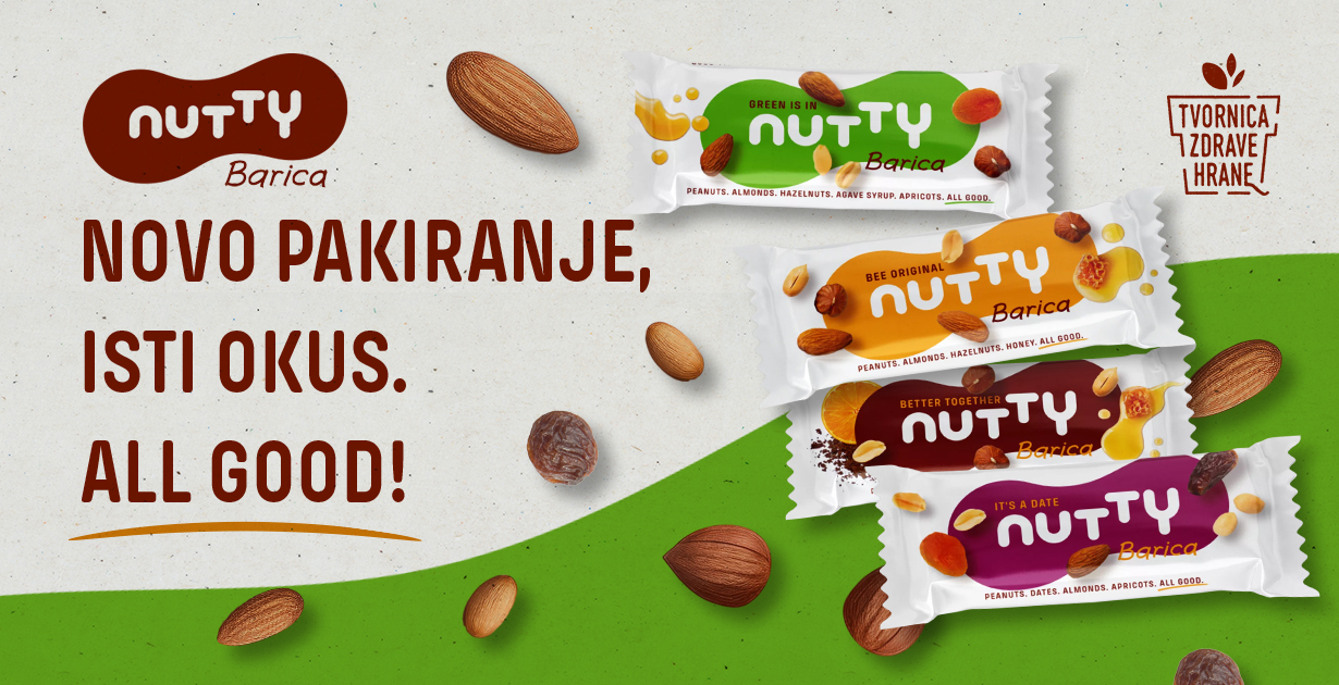 Obojane živahnim bojama, Nutty Barice sada dolaze u novom pakiranju, koje ćete sigurno odmah uočiti, a ono što je bitno je da se unutar novog pakiranja nalaze iste, najbolje Barice. Od sada dolaze i sa novim sloganom – All good, jer ono što vam daju jednostavno je - Sve dobro.