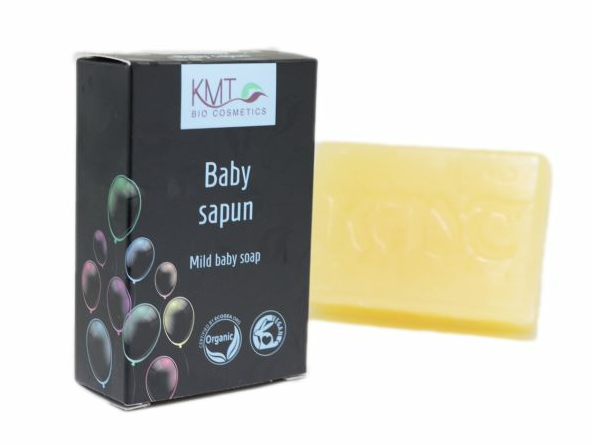 Baby sapun na bazi soka aloe vere i karite maslaca, njeguje osjetljivu kožu, blag je, ne peče za oči, može se korisititi za lice i za tijelo. Osim za dječju kožu, pogodan je općenito za suhu i osjetljivu kožu svih uzrasta. Biranje dječjeg sapuna u svakom slučaju zahtjeva dodatan oprez jer je dječja koža osjetljivija, zbog čega KMT Bio Cosmetics ima razvijenu posebnu formulu za dječju njegu – u obliku krutog sapuna.
