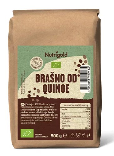 U Tvornici Zdrave Hrane možete kupiti organsko brašno od kvinoje! Nutrigold brašno od quinoe dobiva se finim mljevenjem sjemenki, zadržavajući suptilnu slatko-orašastu aromu i sve hranjive vrijednosti. Nutrigold brašno od quinoe je 100% organski proizvod iz ekološkog uzgoja proizveden pod strogo kontroliranim uvjetima i sastoji se od 100% kvinoje, a uz to: