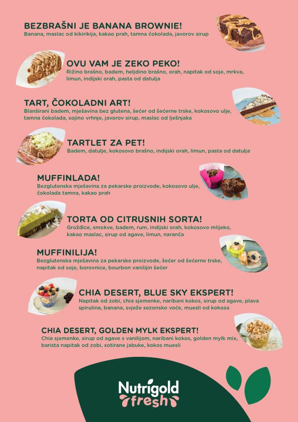 Bezbrašni brownie od banana, maslaca od kikirikija, kakao praha, tamne čokolade i javorovog sirupa. Tartlet za pet koji krije badem, datulje, kokosovo brašno, indijski orah, limun, pasta od datulja. Onda jednu tortu od limuna i mrkve koju smo nazvali "Ovu vam je zeko peko!", famozni veganski čokoladni tart i Chia desert - blue sky ekspert! su samo neki od neodoljivih slastica koje mogu biti i desert i doručak.