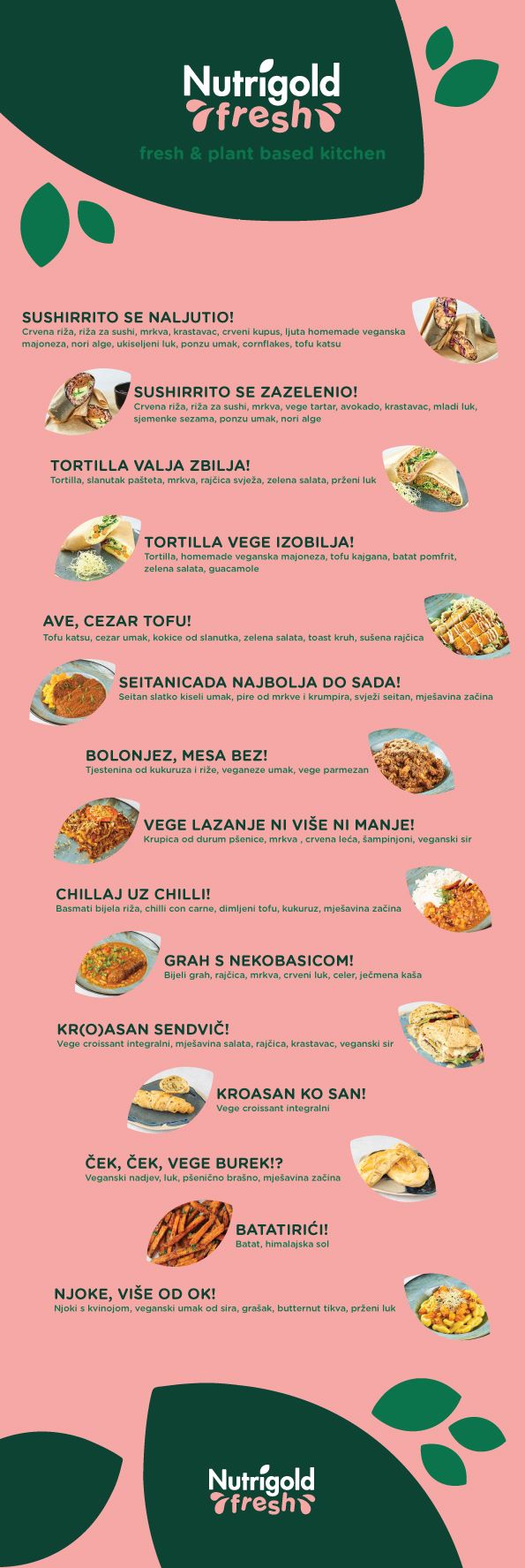 Nakon dosta riječi hvale, shvatili smo da bi naša vlastita robna marka Nutrigold mogla dobiti brata. Rodio se Nutrigold fresh koji pakira najzdravija jela i sokove koje možete uzeti za van, a koje vješto spremaju kuhari i gastroznalci okupljeni pod imenom Zdravo! - restoranom, cateringom, zalogajnicom, ma kako god želite.
