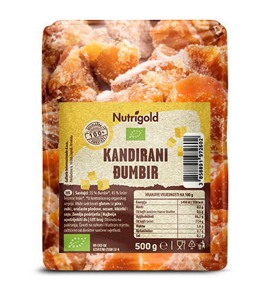 Nutrigold kandirani đumbir je dobiven iz korijena đumbira iz certificiranog organskog uzgoja koji je polako kuhan u kvalitetnom šećeru iz šećerne trske te potom uvaljan u grublji šećer kako bi sačuvao svoj originalan, slatkasto - ljutkasti okus koji može podsjetiti i na arome limuna. Predstavlja idealnu zamjenu slatkišima zahvaljujući svojim nutritivnim vrijednostima koje dolaze u simpatičnom obliku malih, zlatno žućkastih kockica kojima naprosto ne možete odoljeti. Stoga, ukrasite svoje recepte ovom zdravom poslasticom, grickajte za vrijeme najdražeg filma, ili ponesite kao snack na posao.